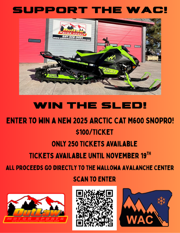 Thanks to our sponsor Outlaw Motorsports in Enterprise, we’re excited to announce an exclusive fundraising raffle benefiting the Wallowa Avalanche Center. This is your chance to win a brand new 2025 Arctic Cat M600 SnoPro snowmobile, designed for ultimate performance and excitement on the snow!